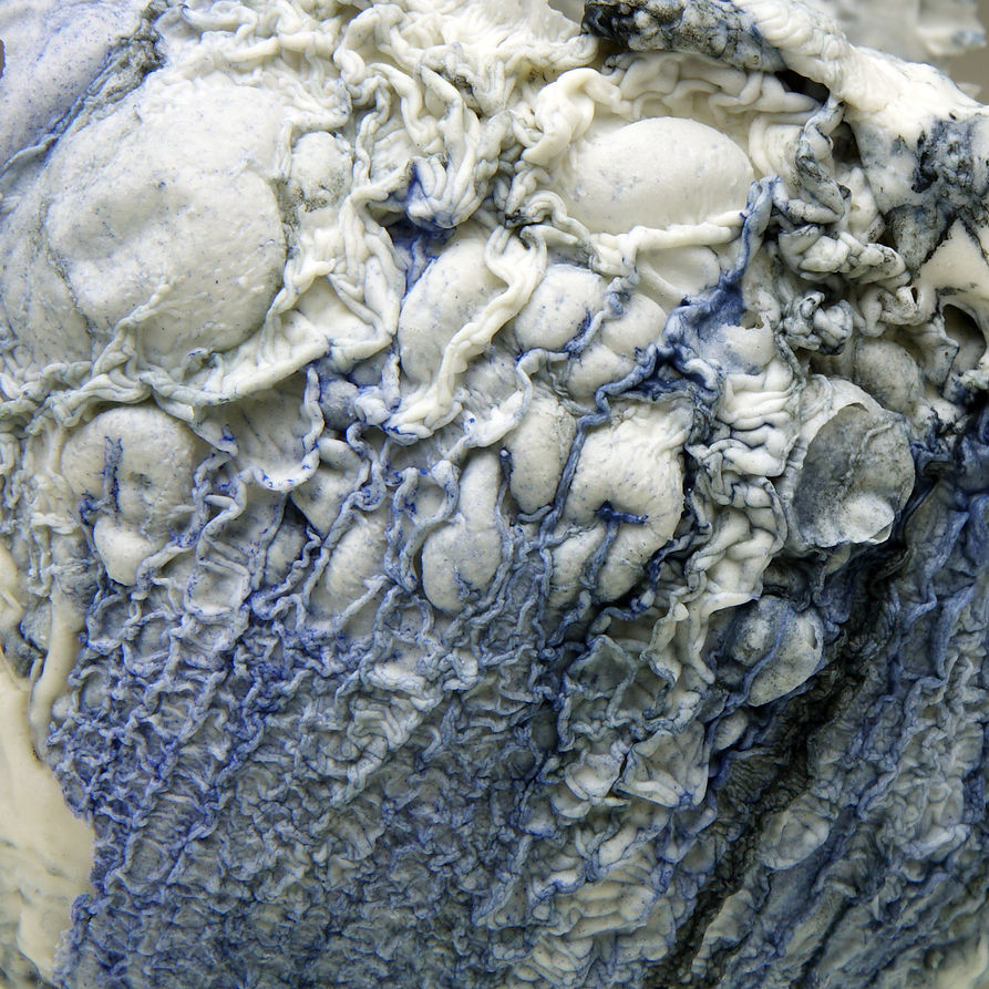 Slip applied to fully inflated balloon, sprayed with black Mason stain and allowed to partially dry. Sprayed again with red Mason stain dissolved in sodium silicate. Allowed to dry partially and then deflated. The greater stiffness of the sodium silicate created the ladder textural effects.
